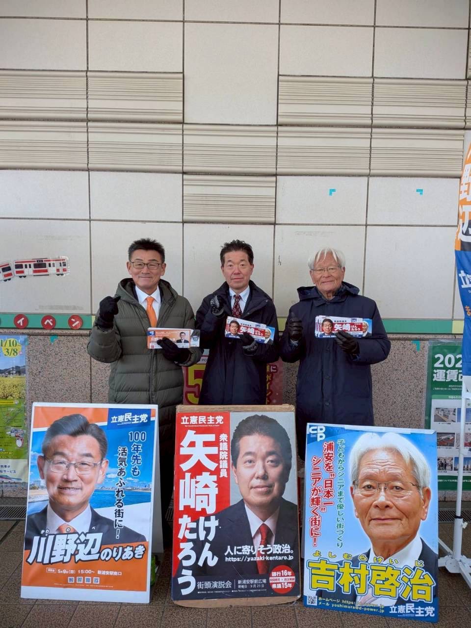 舞浜駅北口 駅頭活動 2026 1/24 活動ブログ 活動報告 20260124. 1/22朝は舞浜駅北口で、「吉村啓治」浦安市議、「川野辺のりあき」浦安市議と駅頭を行いました。今シーズン1番の寒さと感じる中でしたが、多くの皆さんにご挨拶することができました。選挙に向けての準備を急ピッチで進めています。今回は解散から投開票日まで16日間という超短期決戦ですので、事務所スタッフ、支援者の皆さんの力をお借りしながら、万全の準備をしたいと思います。 活動ブログ 活動報告 よかったらシェアしてね! URLをコピーしました! URLをコピーしました! 妙典駅 駅頭活動 原木中山駅西口 駅頭活動 この記事を書いた人 yazaki_kentaro 関連記事 原木中山駅西口 駅頭活動 20260126. 矢崎コラム vol.85 20260123. 妙典駅 駅頭活動 20260123. 南行徳駅南口 駅頭活動 20260122. 本八幡駅北口 駅頭活動 20260121. 市川駅シャポー南口 駅頭活動 20260119. 行徳駅北口 駅頭活動 20260117. 市川駅西口 駅頭活動 20260116.