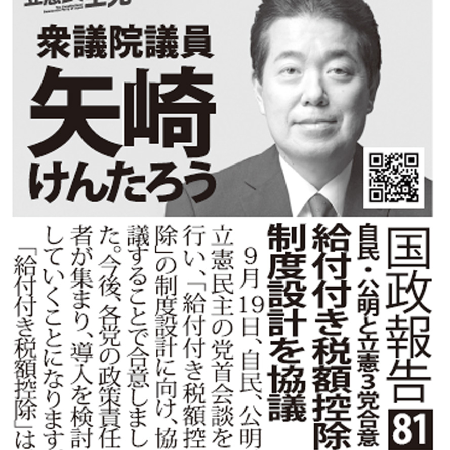 9月19日、自民、公明、立憲民主の党首会談を行い、「給付付き税額控除」の制度設計に向け、協議することで合意しました。今後、各党の政策責任者が集まり、導入を検討していくことになります。